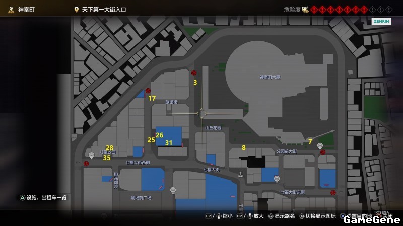 举例子,比如LOVE MAGIC 成人用品店。位置:横滨10,浪漫路东南方。那就在上图10标注位置,此位置再找到街道浪漫路,然后就能找到商店。