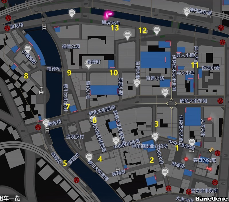 | 10 | 5万 | 神室町1 | 旅馆街东侧,道路交叉口 |