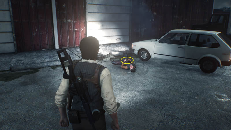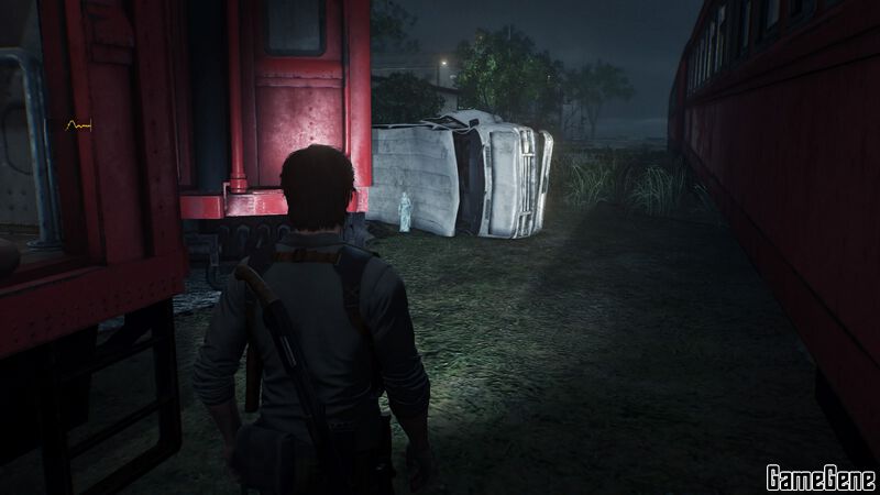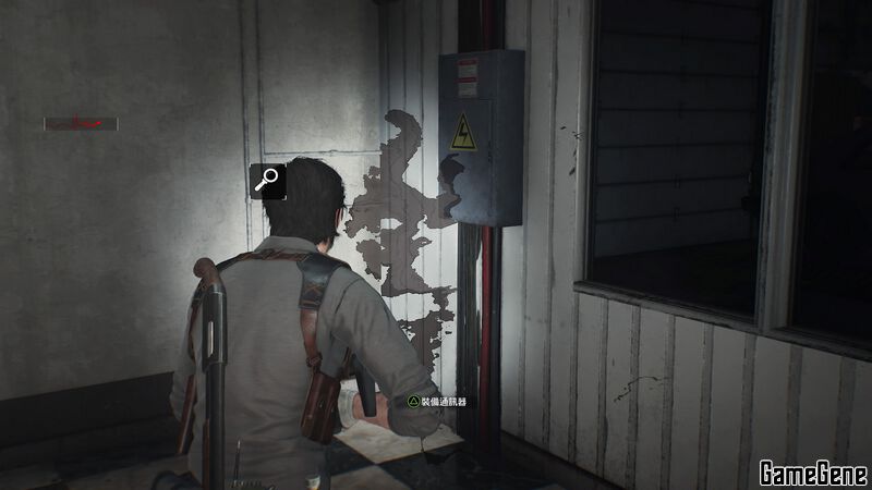原路下车,从车屁股后面绕过去,走两列火车之间的通路,一直走到看到一个翻倒的汽车,角落里可以拿到「置物柜钥匙」