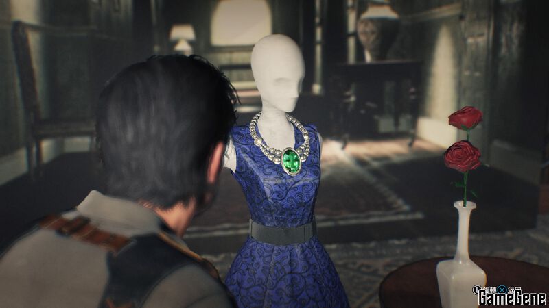 出门会有新的通路,一直走到头,再回头走,再回头,按照这个方式直到进入一扇门,地上有项链和玫瑰,调查椅子上的模特头部,会到下一个场景。